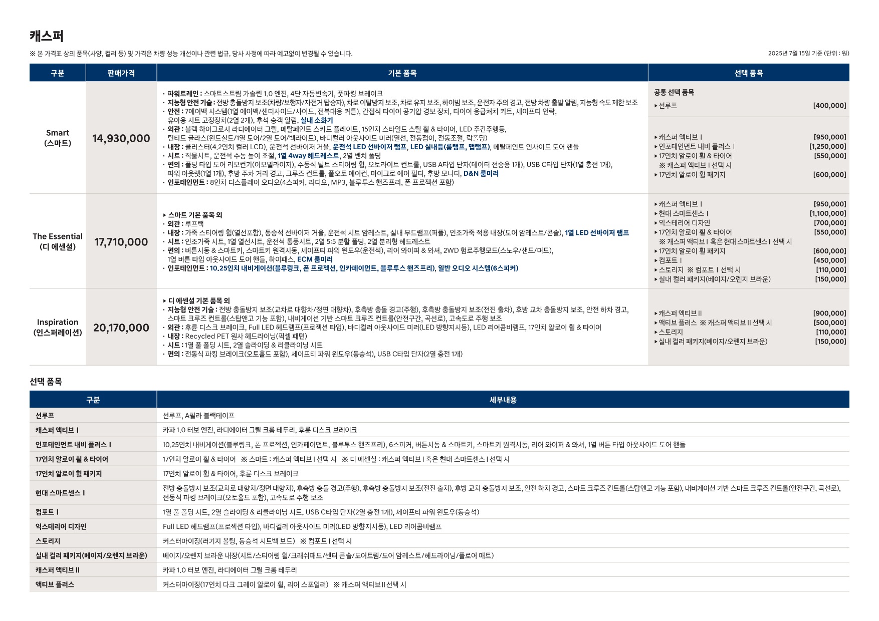 | 2026년형 캐스퍼 일렉트릭 신차가격표 . 2026 캐스퍼 일렉트릭 가격표 옵션표 등급표 (2) | 2025.07.16 |
